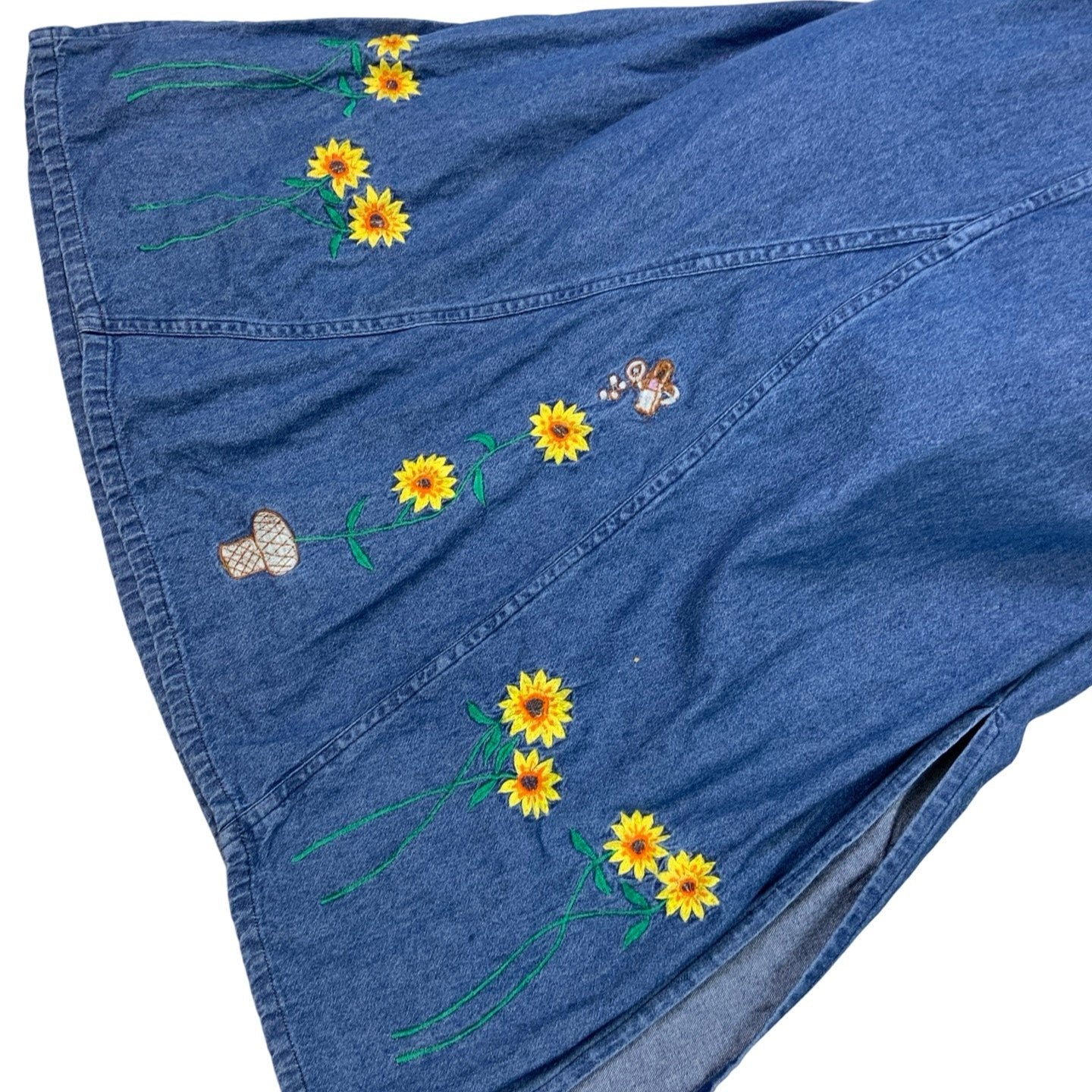 Y2K 90s 'Turn Around' Blue Denim Embroidered Sunflower Sleeveless Midi Dress M 16