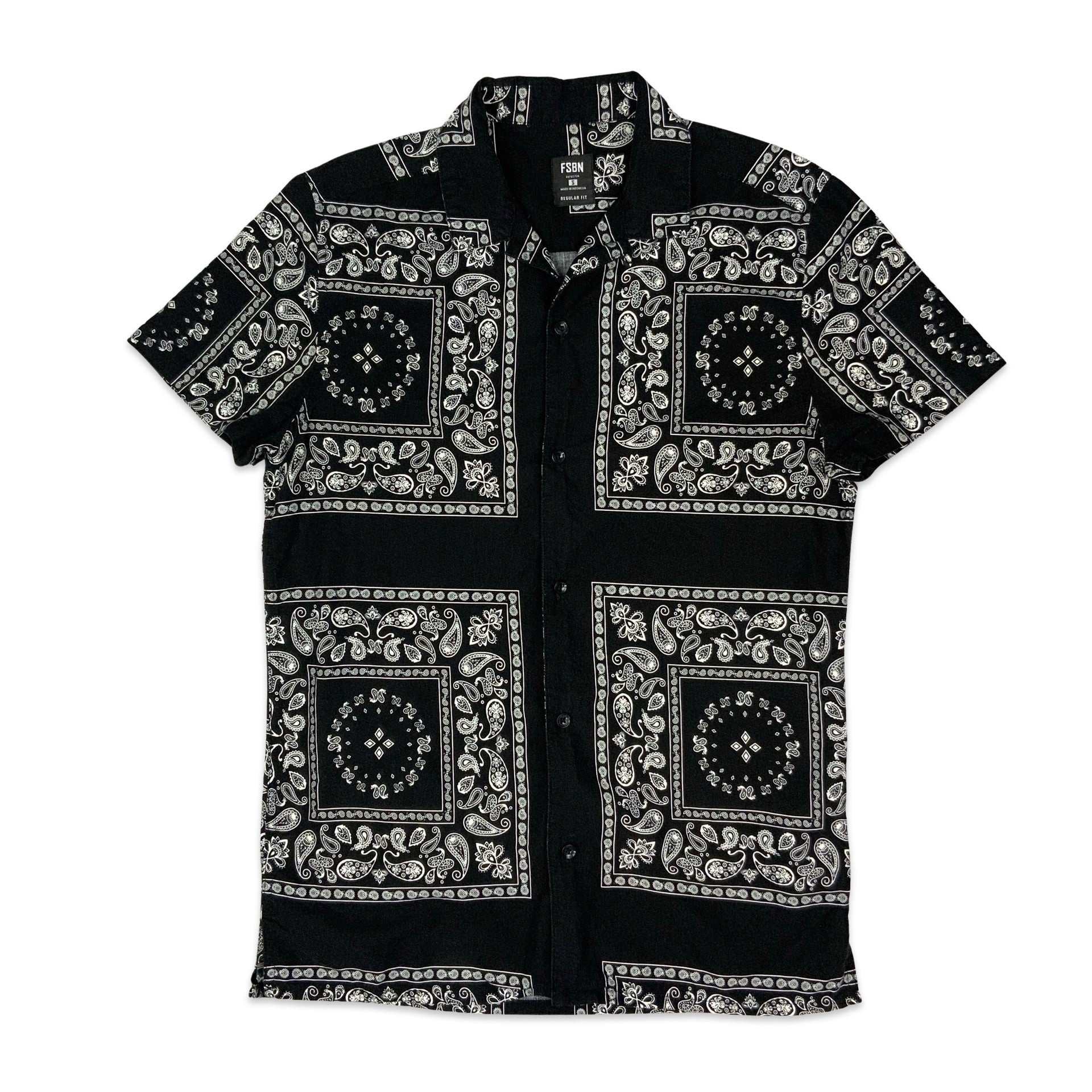 Men’s Y2K short sleeve shirt. Black & white paisley print with black buttons. Cotton, viscose mix.