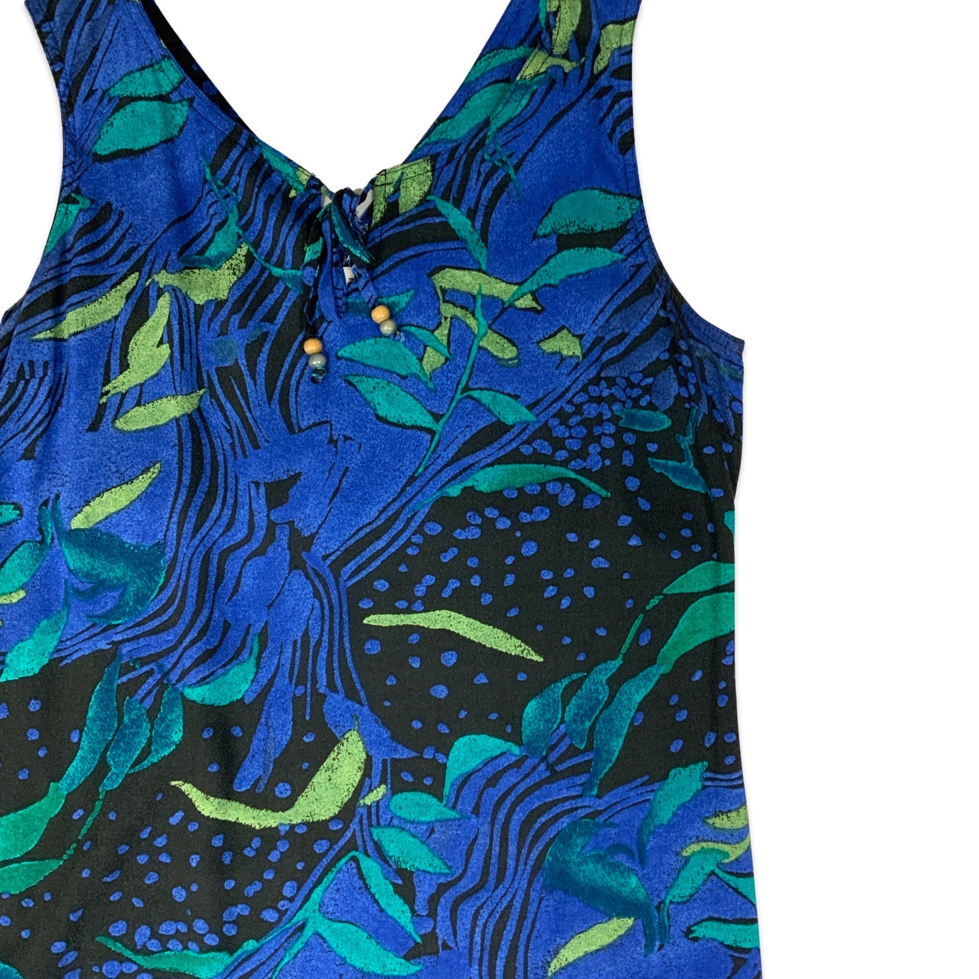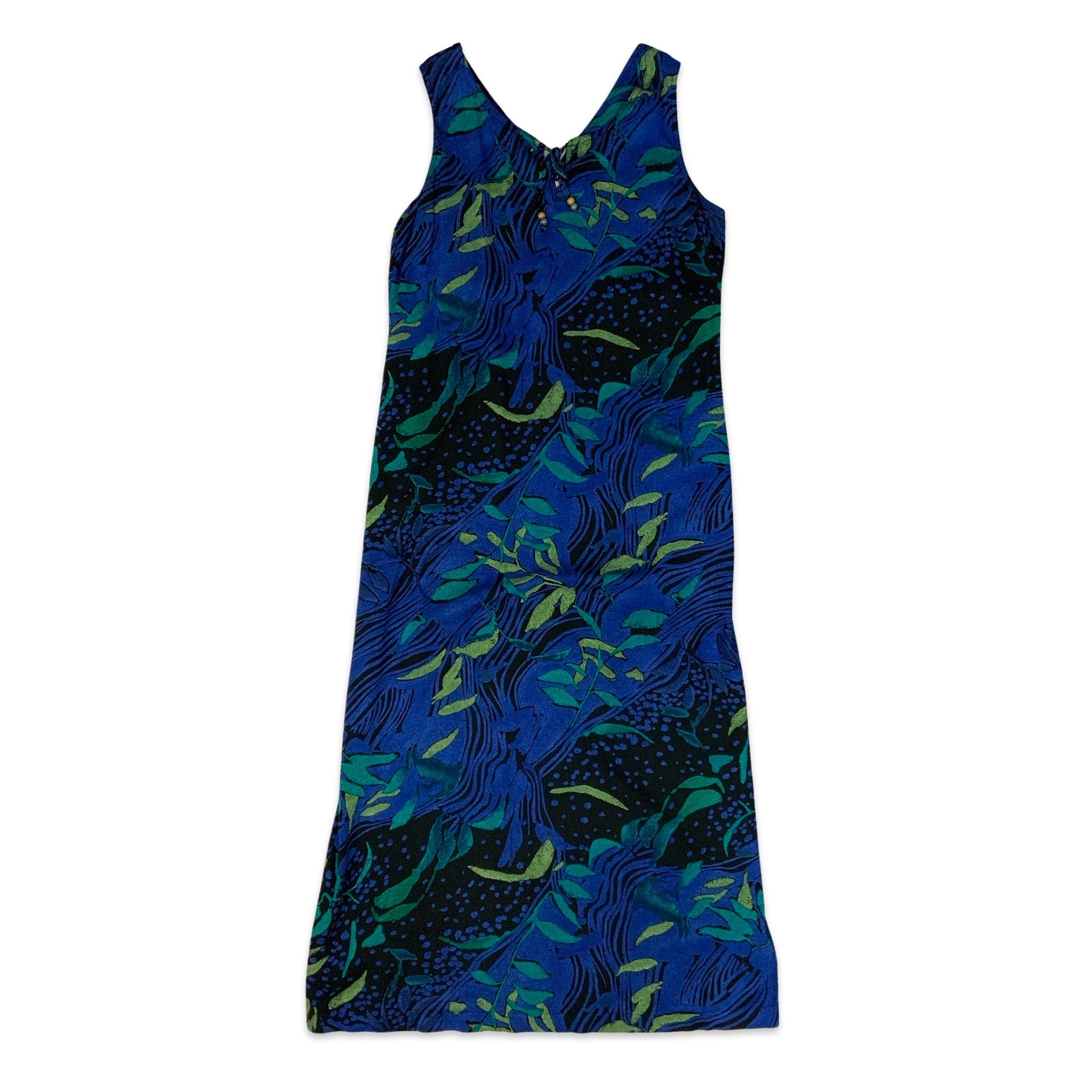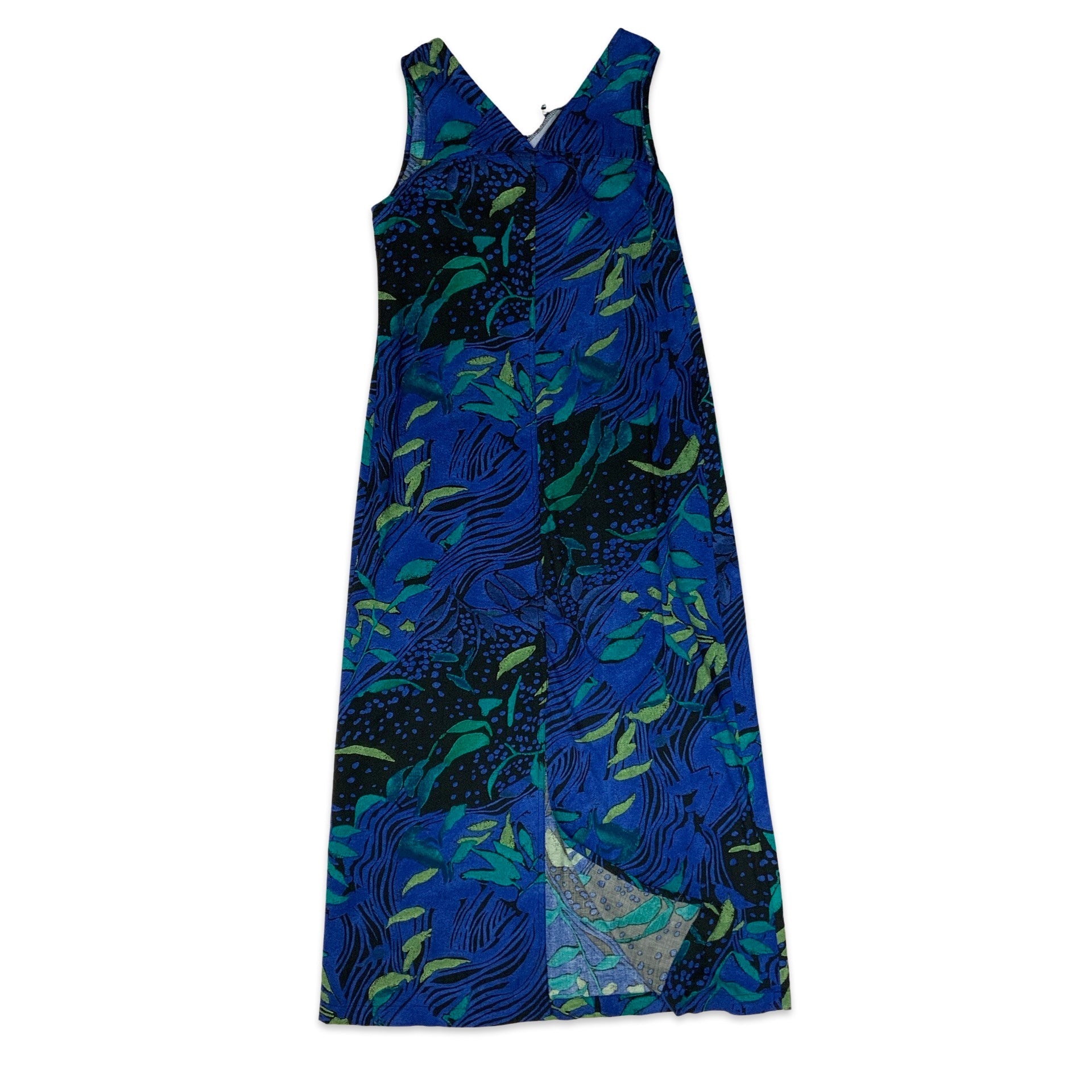 Y2K sleeveless maxi dress in a blue and navy botanical print. Back slit and front beaded collar tie.