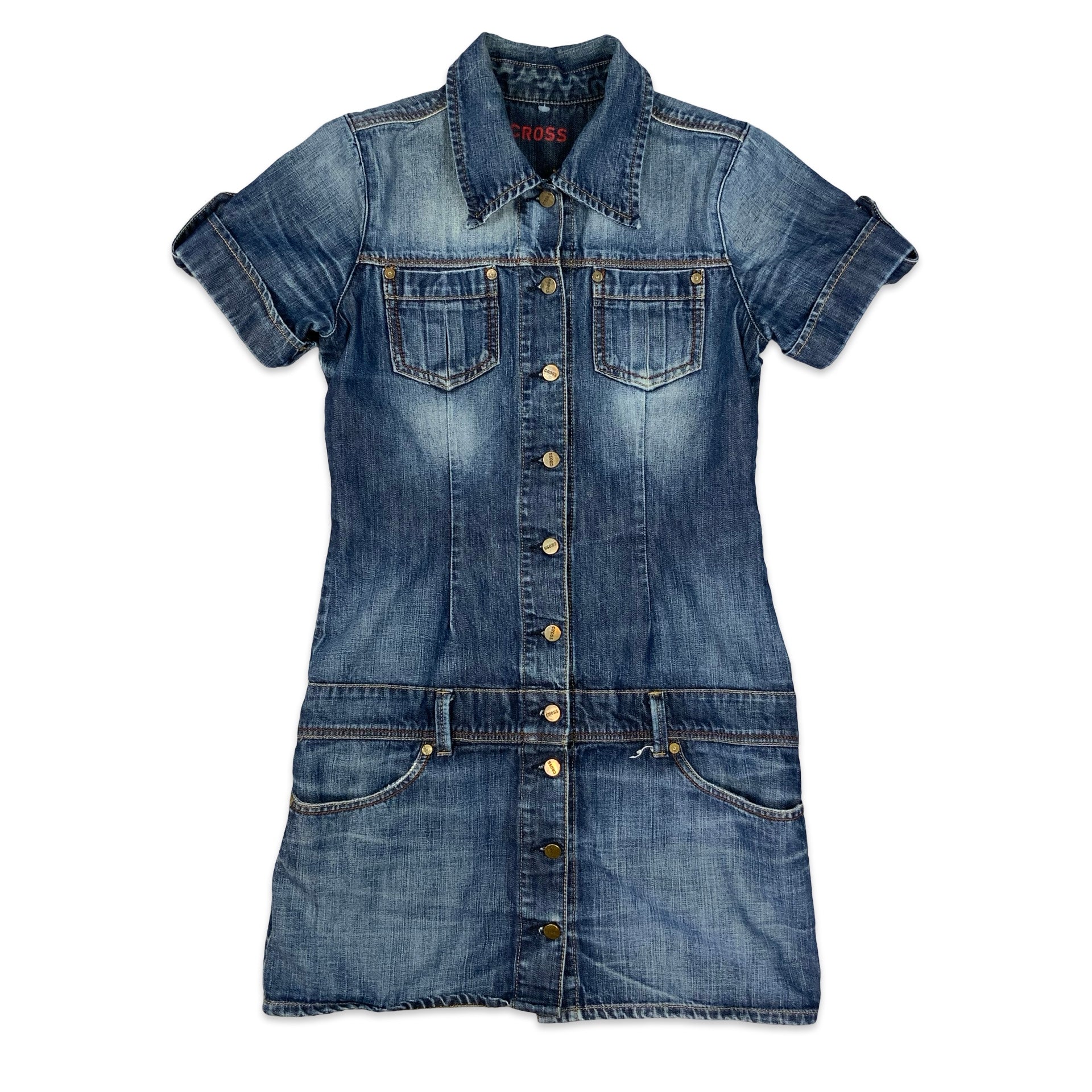 Preloved Y2K blue denim short sleeved button-up mini dress.
