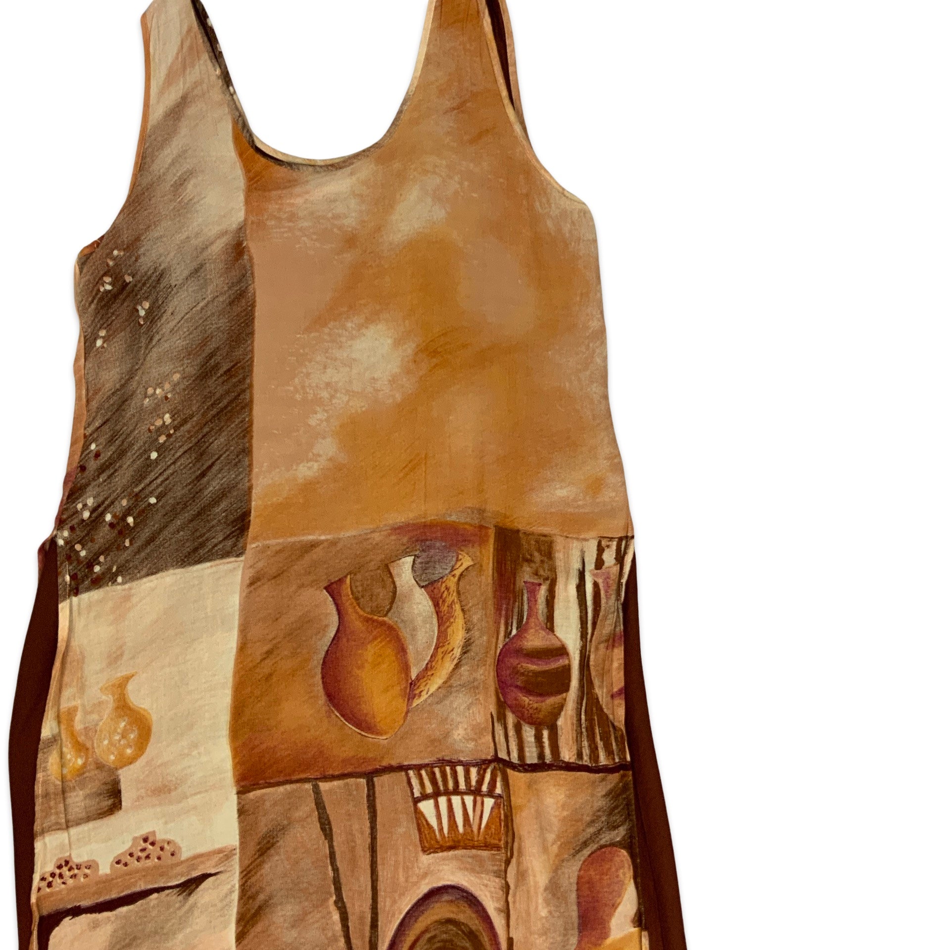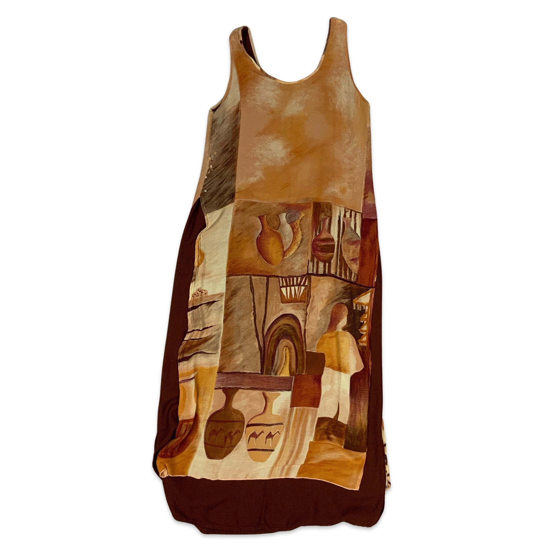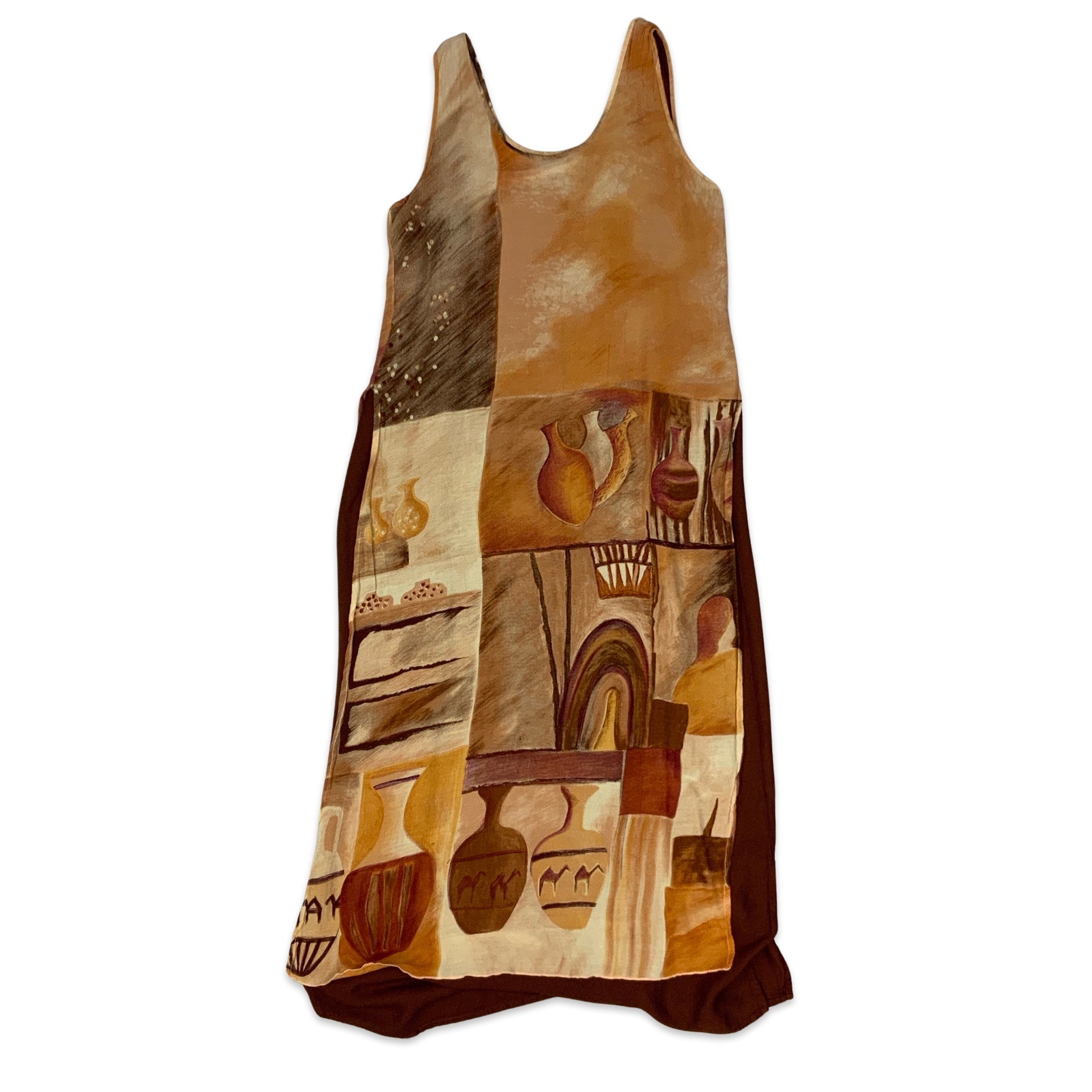 Preloved Y2K lined sleeveless maxi dress with abstract all-over print in brown.