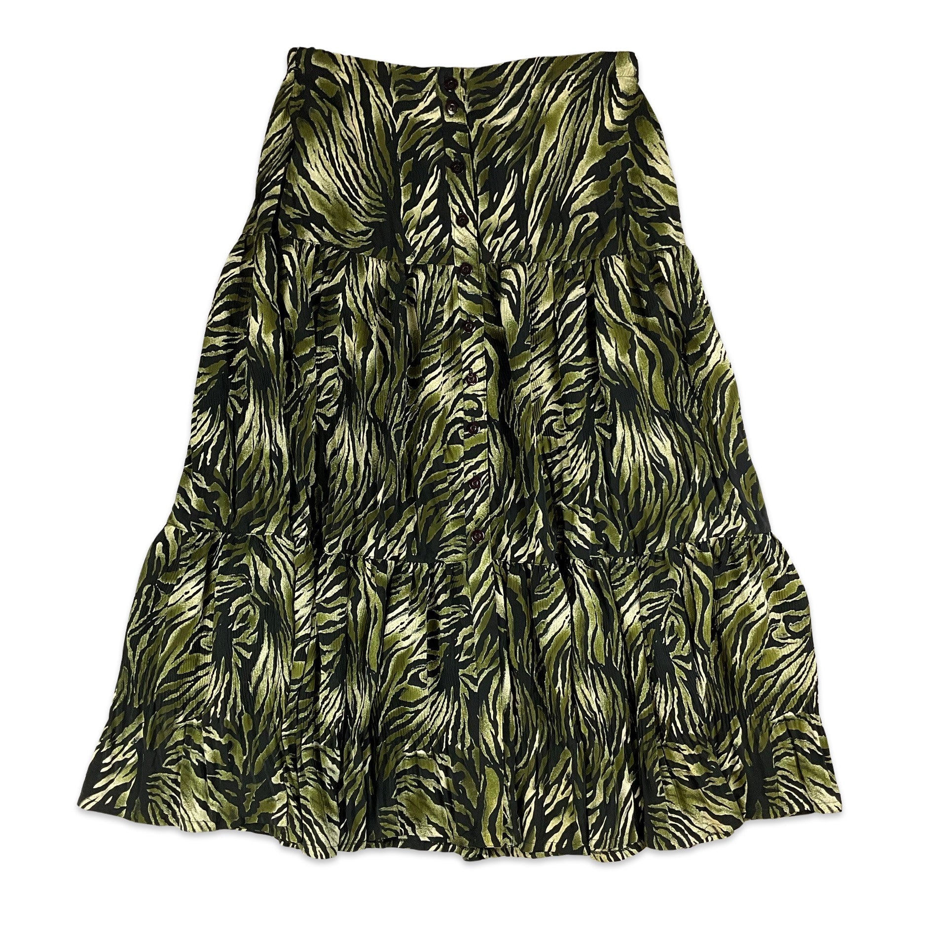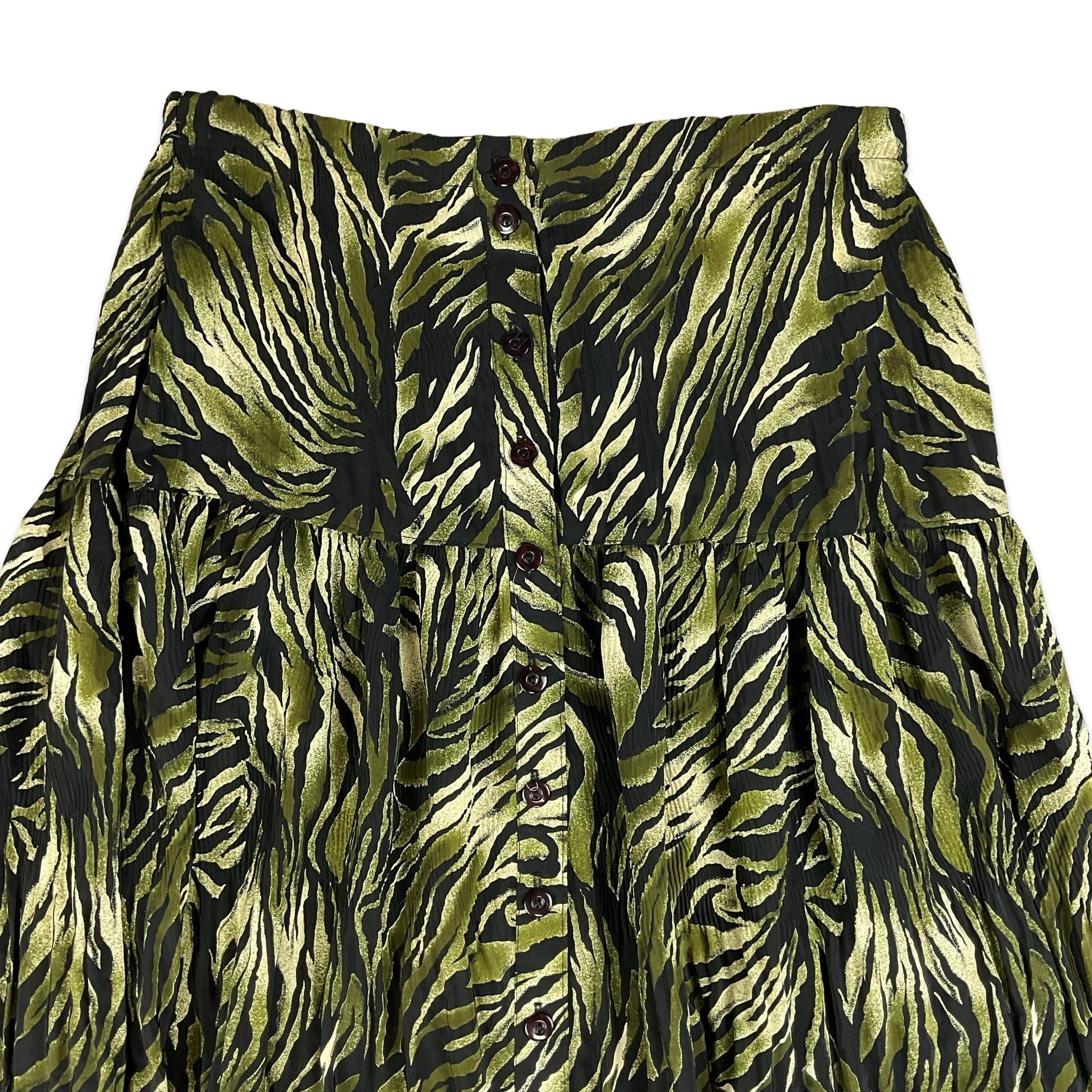 Women’s Y2K button up, flounce skirt. Green, beige and black zebra print fabric with black buttons.