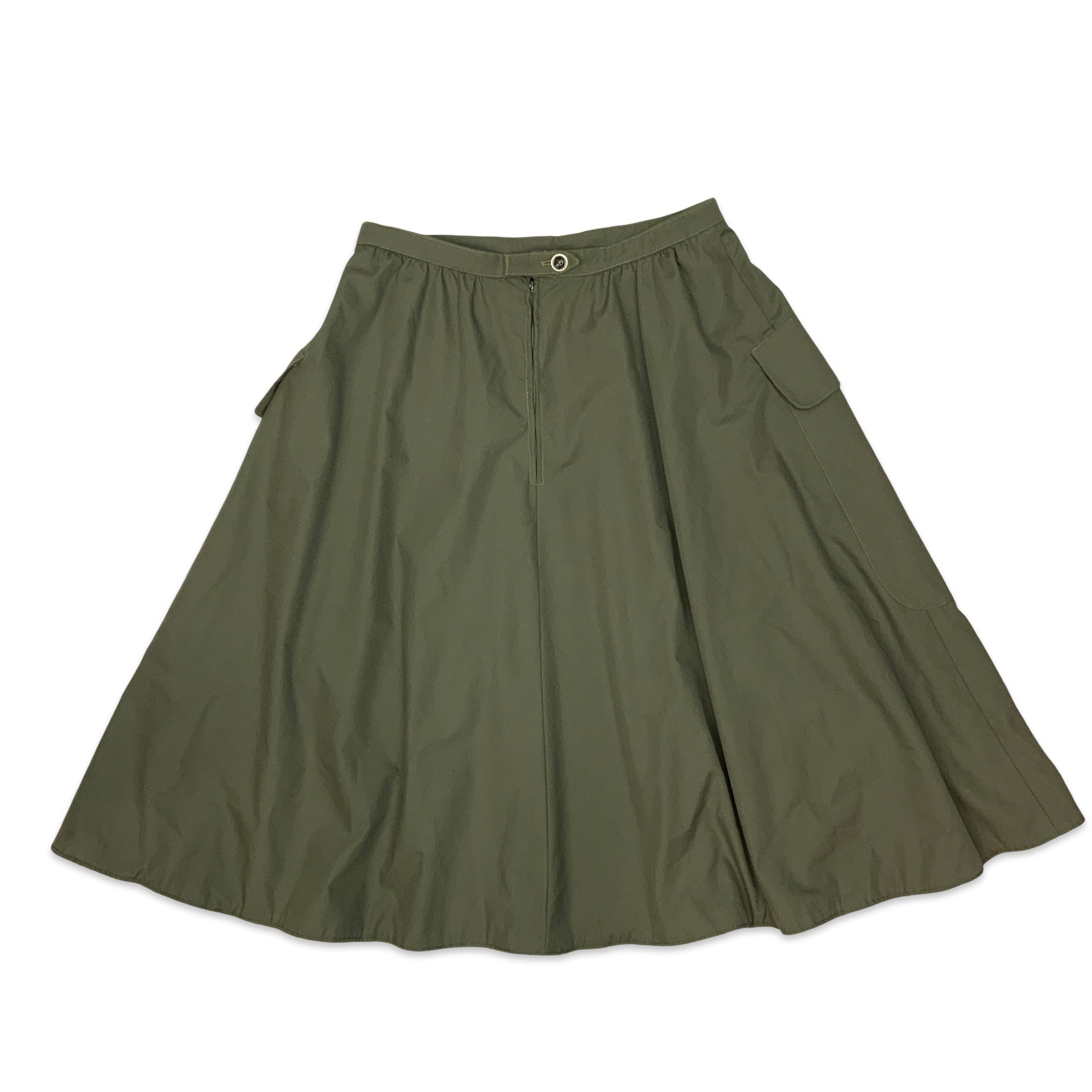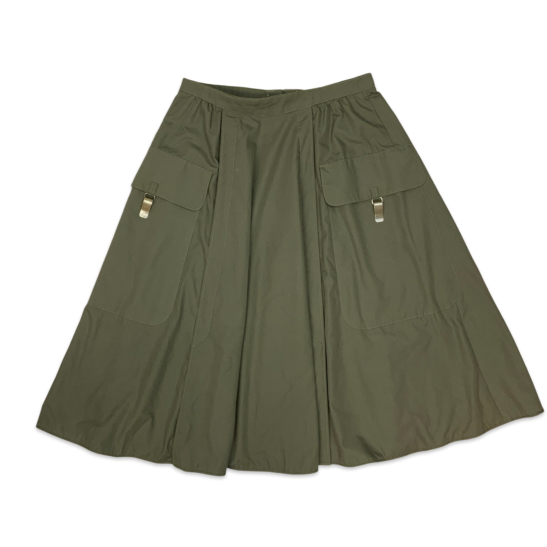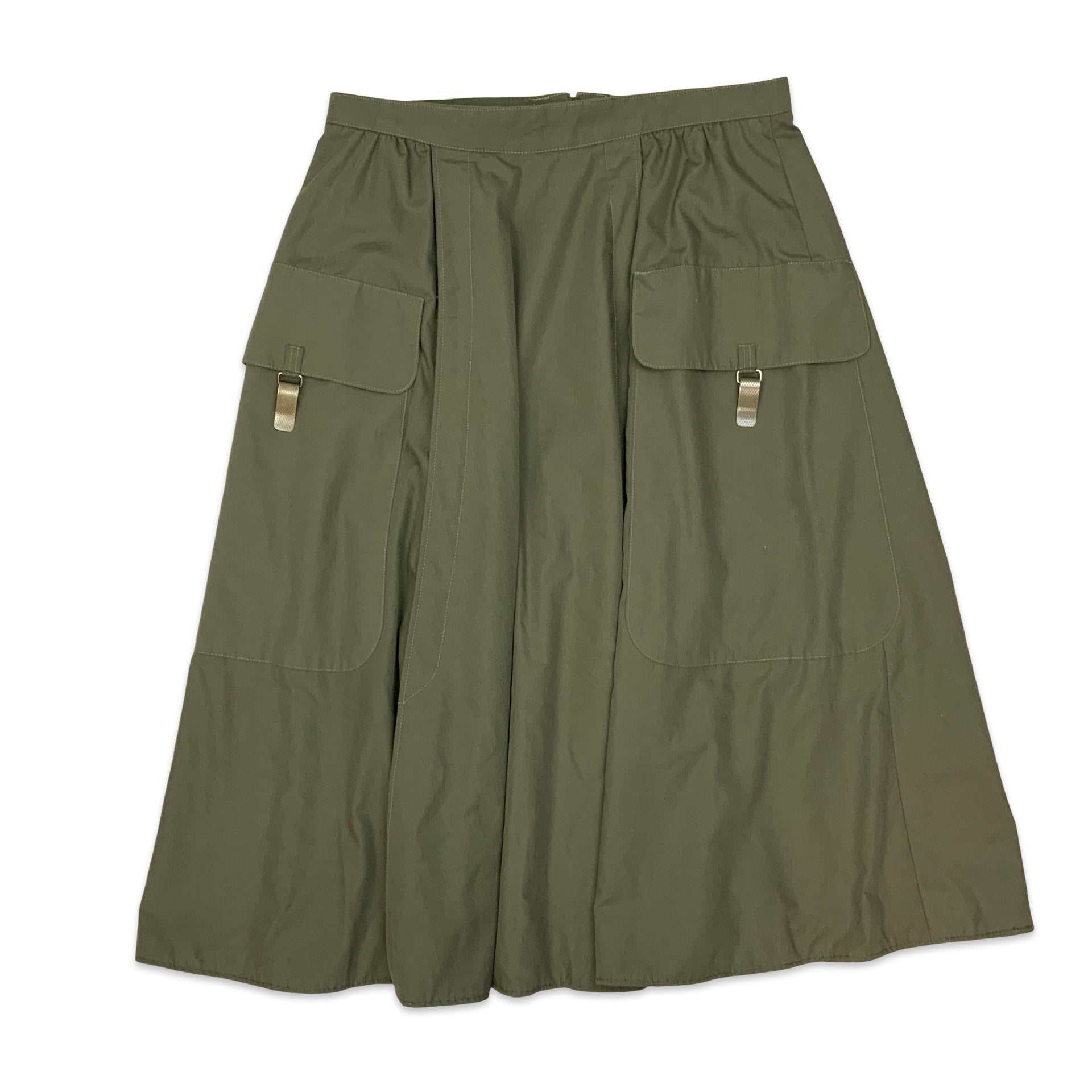 Women’s Y2K Aline cargo skirt. Dark khaki green fabric with large front pockets and back zip & button fastening.