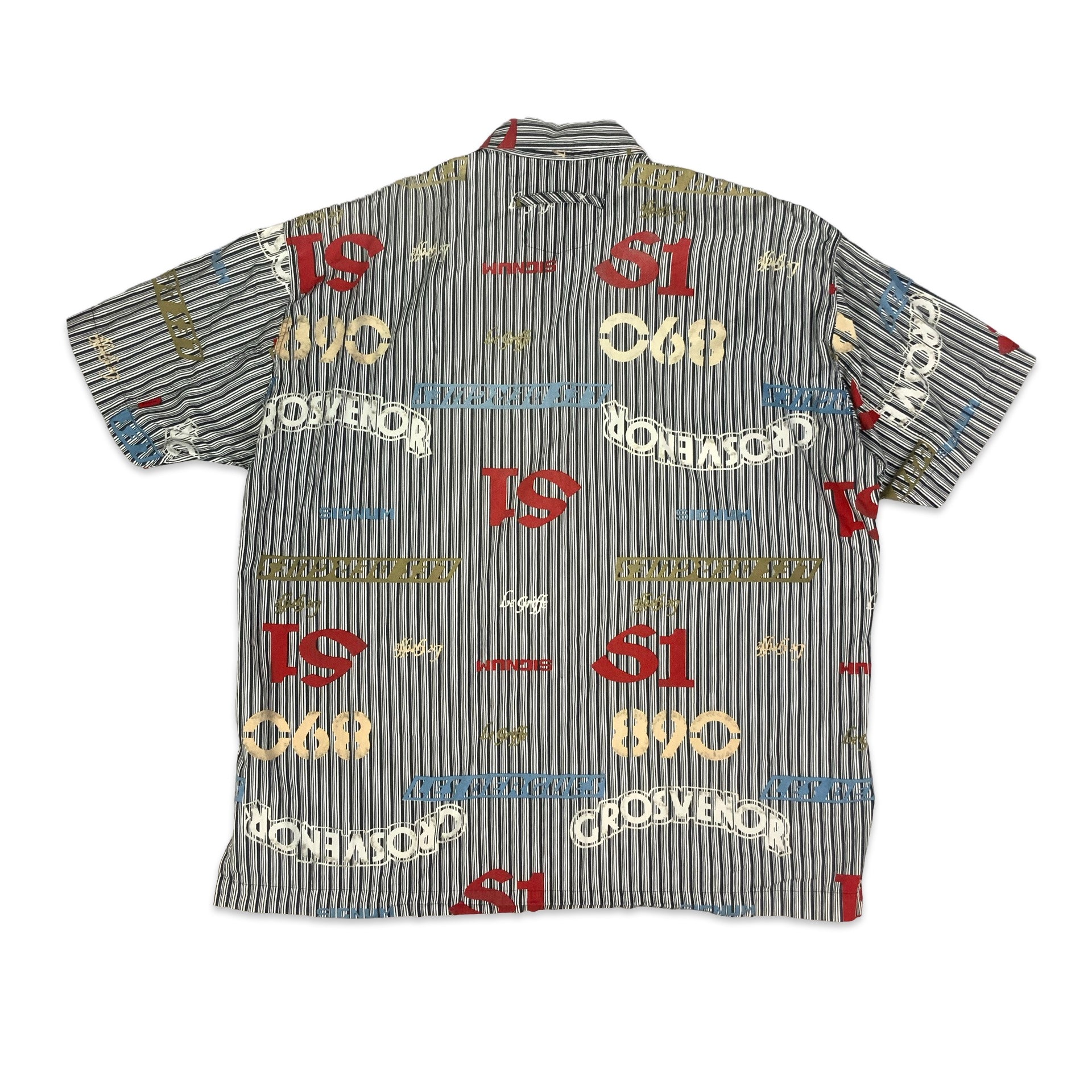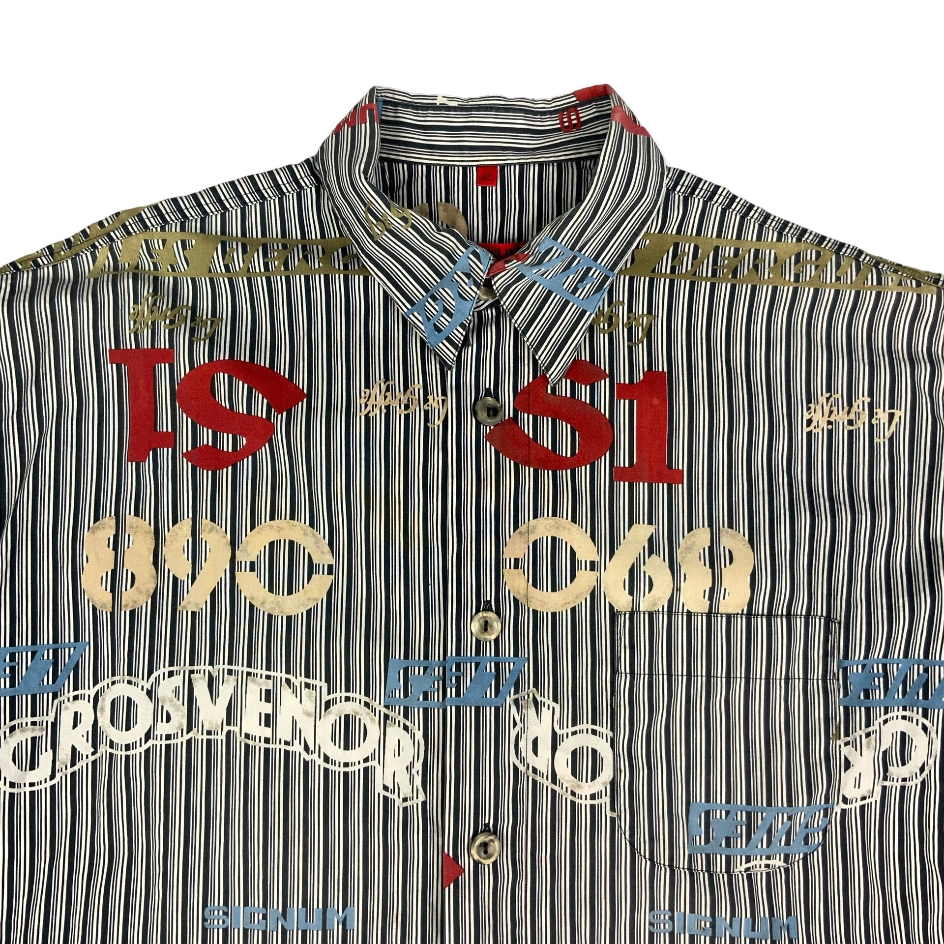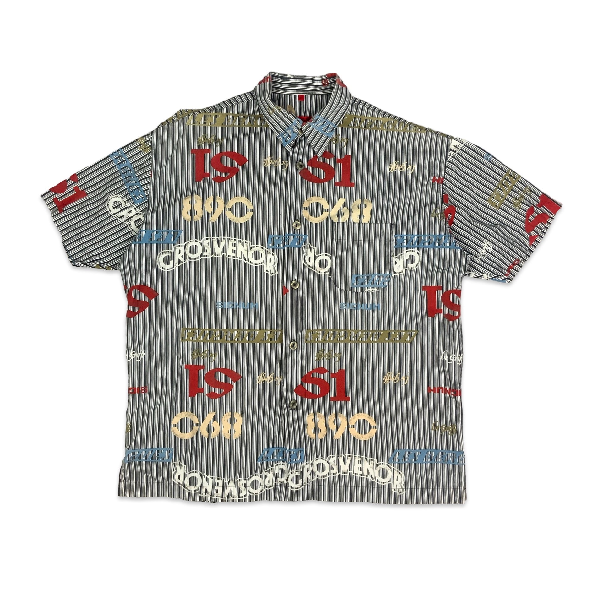 Men’s y2K short sleeved shirt. Black & white stripes with red, blue, white & gold text print. Iridescent grey buttons.