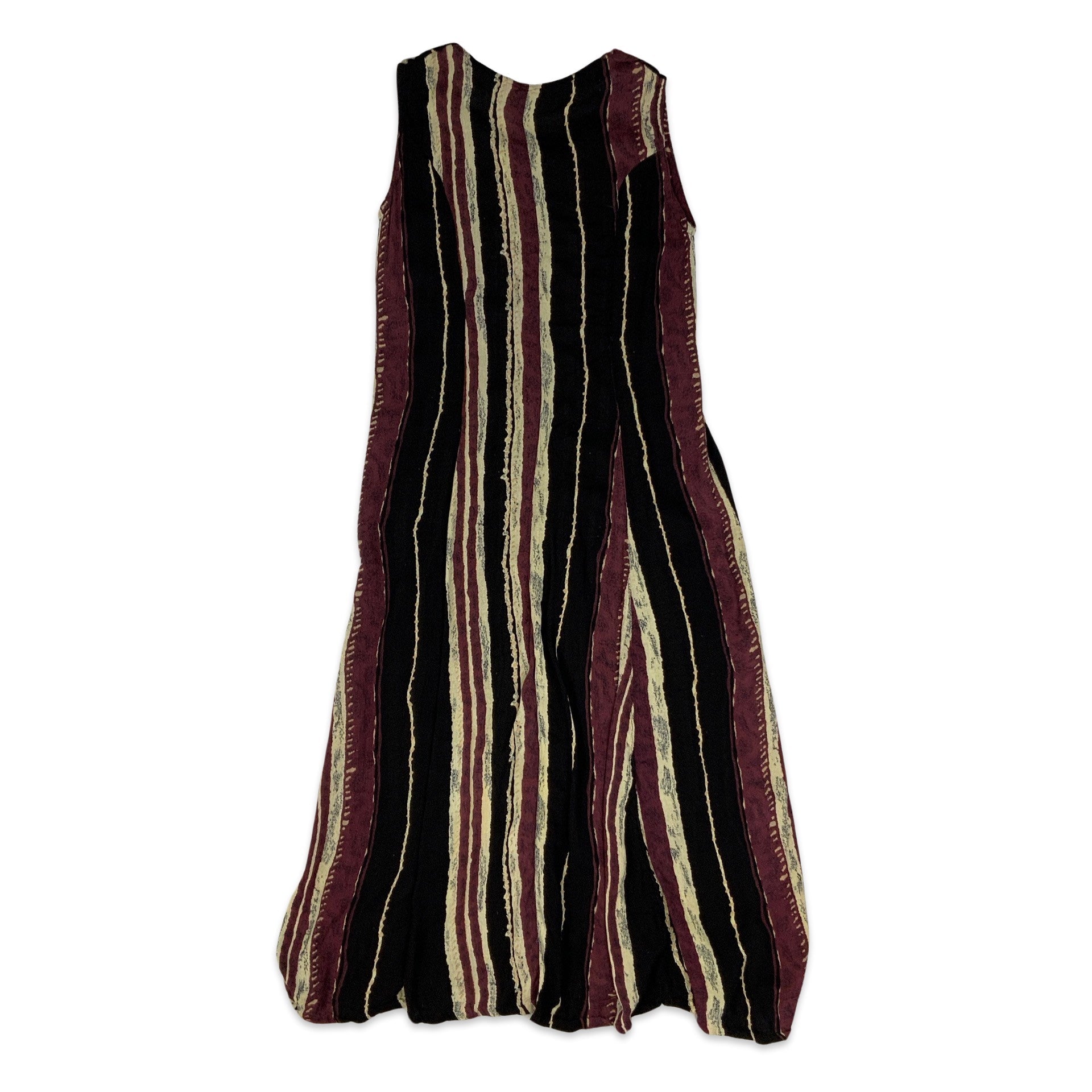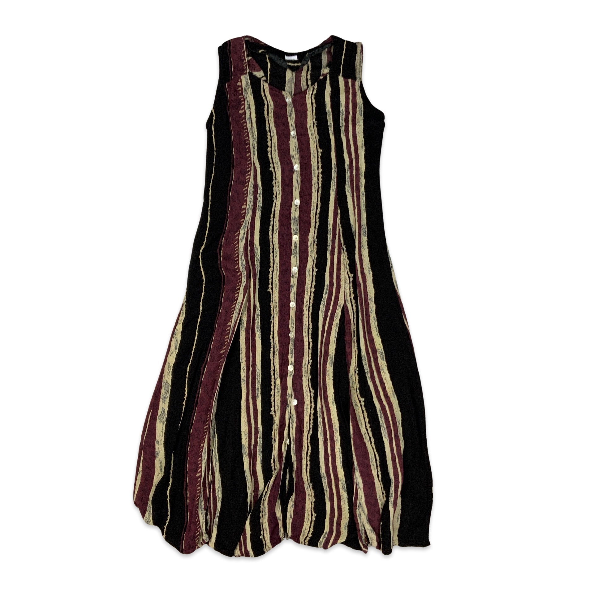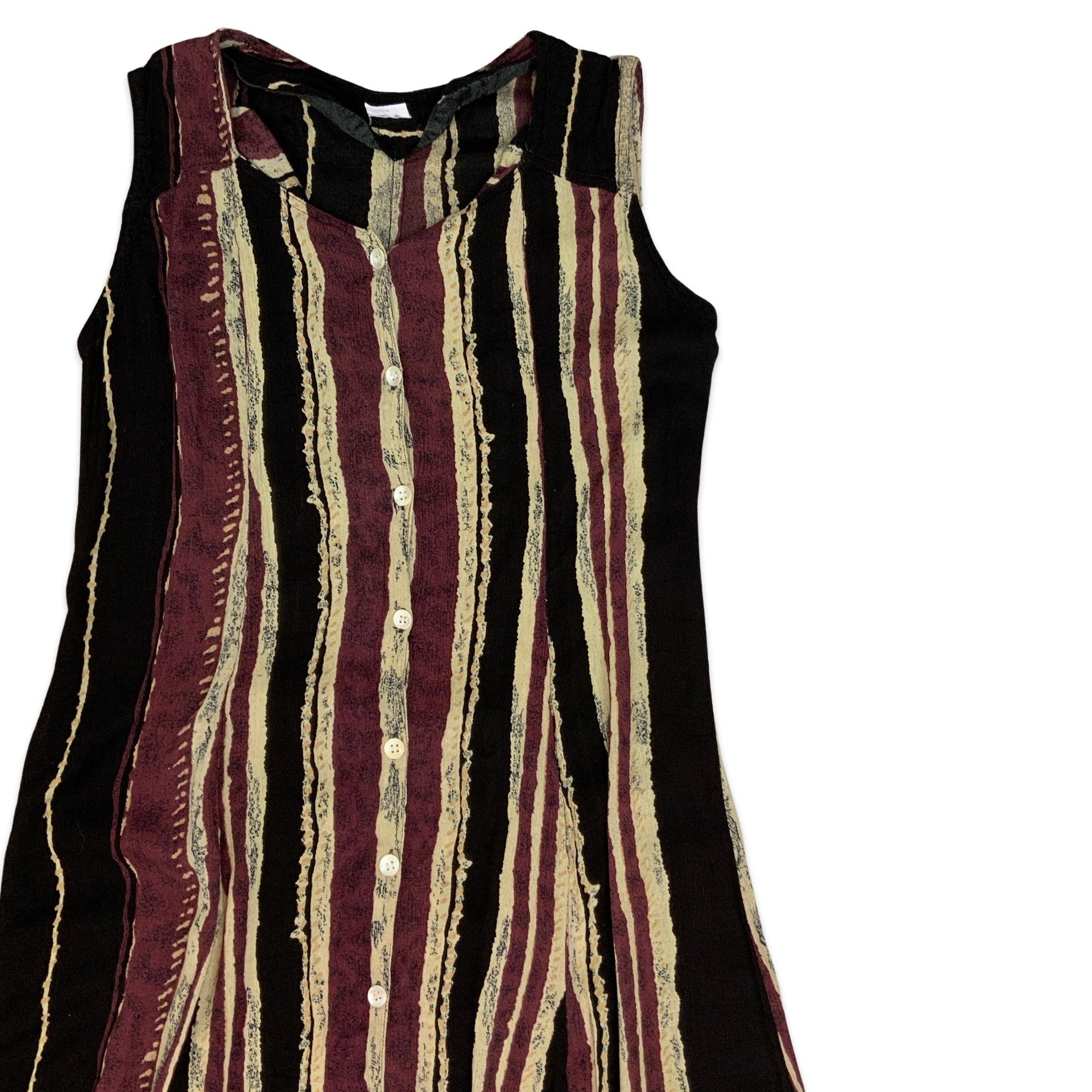 Vintage striped button-up sleeveless maxi dress in purple. black, and beige.