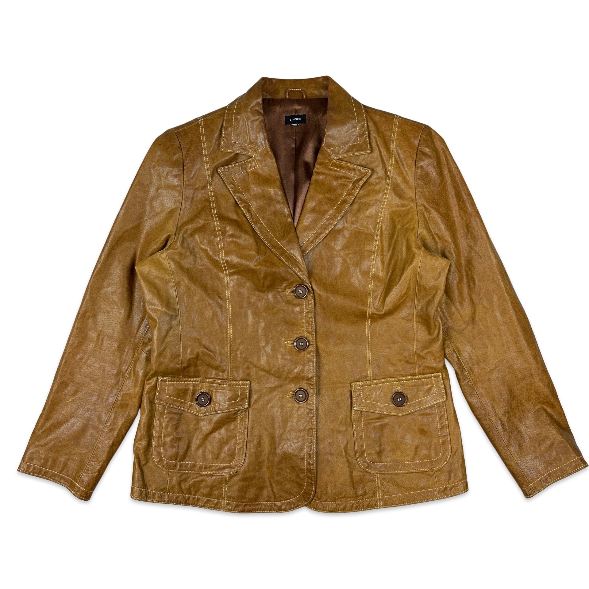 Preloved vintage Y2K tan genuine leather ladies blazer. Beige contrast stitch detail throughout.