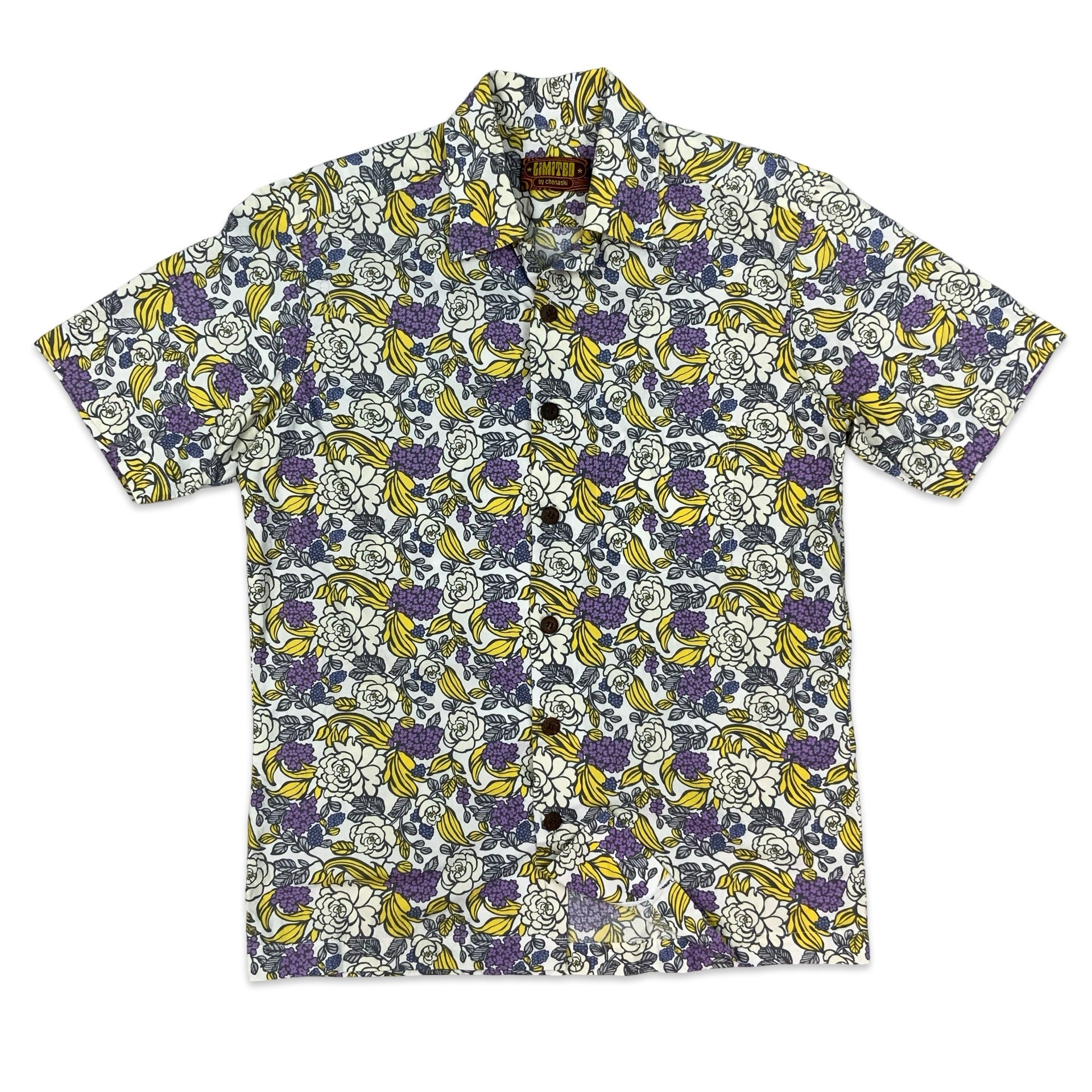Vintage Y2K Aloha shirt in white, purple , and yellow botanical print.